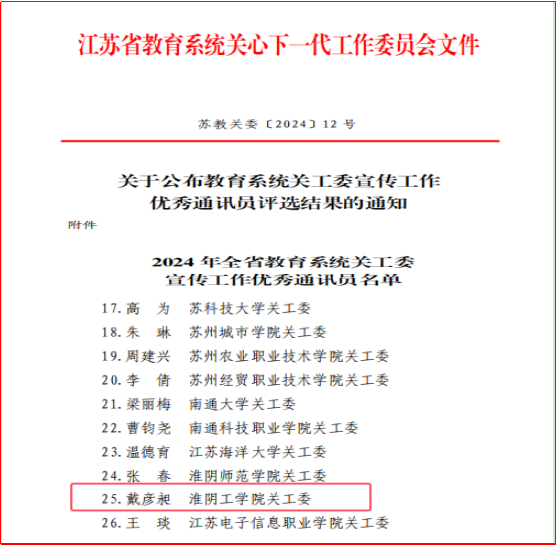 近日,江苏省教育系统关工委印发《关于公布教育系统关工委宣传工作优秀通讯员评选结果的通知》(苏教关委【2024】12号),我校离退休工作处戴彦昶获评2024年全省教育系统关工委宣传工作优秀通讯员。