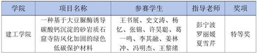 我校建工学院教师彭宁波、罗丽媛、夏雪芹指导的“一种基于大豆脲酶诱导碳酸钙沉淀的砂岩质石窟寺防风化加固的绿色低碳保护材料”项目,围绕绿色低碳环保砂岩质石窟寺防风化加固保护材料研发与应用,创新性地提出了一种绿色低碳、环境友好的大豆脲酶诱导碳酸钙沉淀加固技术。团队成员从千年文明的需求中寻找问题,用前沿的交叉学科知识去破解难题,展现了当代青年科技报国的使命担当。