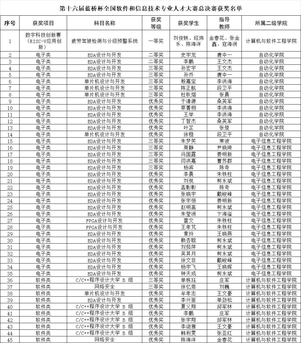 近日,第十六届蓝桥杯全国软件和信息技术专业人才大赛全国总决赛获奖名单揭晓。我校计算机与软件工程学院刘俊轶、经玮乐、陈海洋团队凭借作品《疲劳驾驶检测与分级预警系统》荣获数字科技创新赛一等奖,创我校在蓝桥杯软件类竞赛最好成绩。指导教师金春花、张金鑫、寇海洲获评“优秀指导教师”。此外,我校学子在软件类、电子类、设计类三个领域获二等奖8项、三等奖14项、优秀奖30项。竞赛成绩充分体现了学校持续实施课程建设、实践实训、服务保障“三大工程”的建设成效。