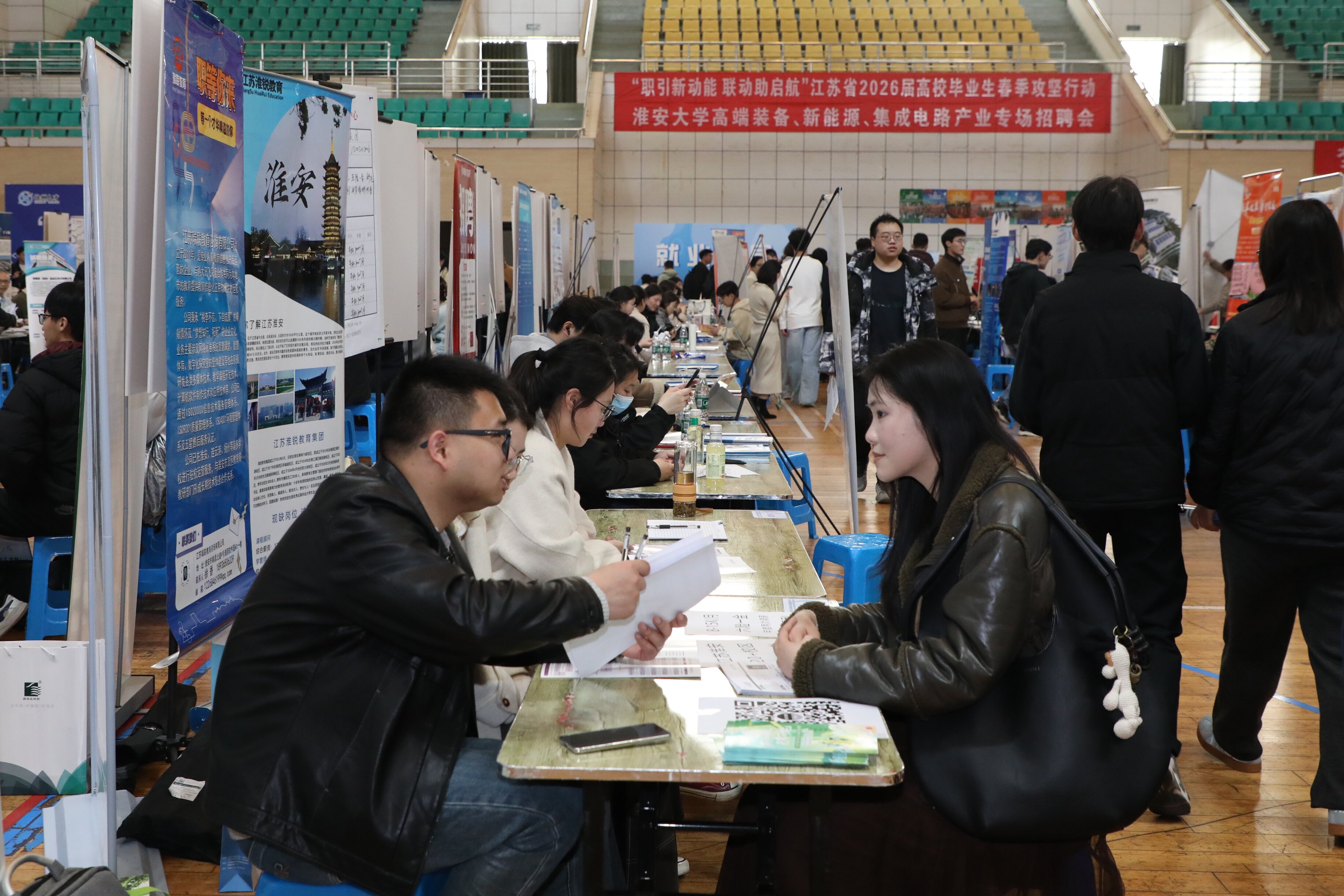 3月26日,“职引新动能 联动助启航”江苏省2026届高校毕业生春季攻坚行动暨高端装备、新能源、集成电路产业专场招聘会在我校举办。本次招聘会由省教育厅、省人社厅、省工商业联合会主办,省高校招生就业指导服务中心、省劳动就业管理中心、省职业介绍中心、淮安市人社局、市工商联和我校共同承办。校党委书记常绿、党委副书记秦家沛和省高校招生就业指导服务中心副主任蔡亮到会场调研指导工作。