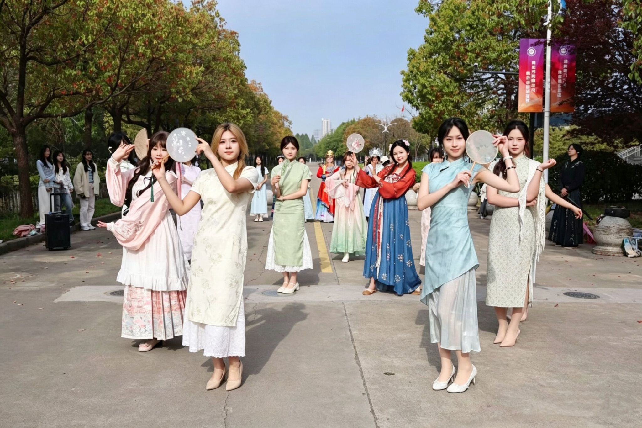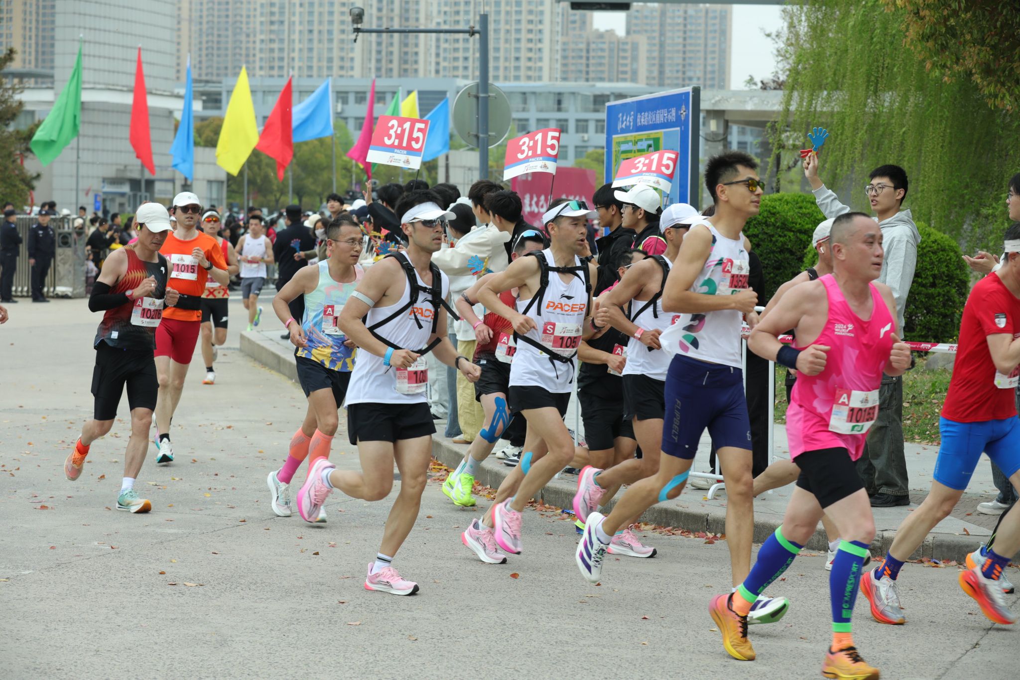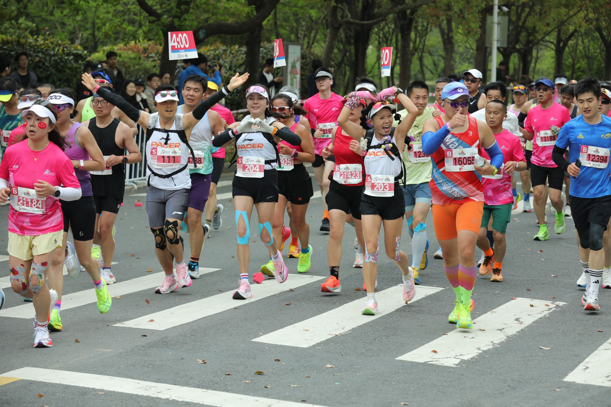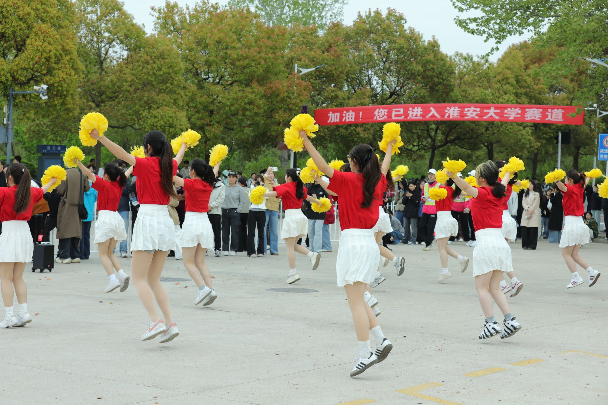 约9时20分后,参赛选手陆续进入我校校园赛道。此时,校园内早已悬挂好为选手加油鼓劲的横幅,赛道上绘画了充满活力的图案,数千名大学生手持加油牌,挥舞着旗帜,用此起彼伏的呐喊声为选手们助力续航。除了啦啦队的激情助威,学校精心准备了多个特色表演项目,将现场的气氛烘托至沸点。