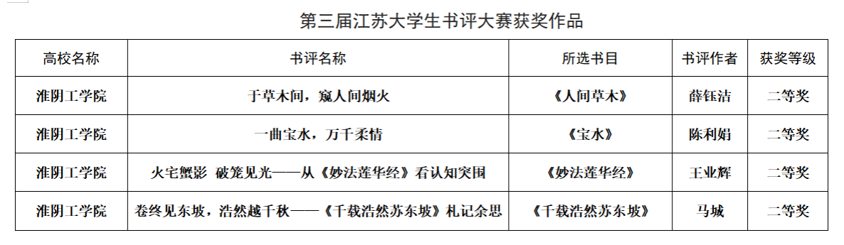 近日,由江苏省教育厅主办、江苏省高等教育学会协办的第三届江苏大学生读书文化节相关推荐活动落下帷幕,我校人文学院的两件作品入选江苏百万学子“云诵读”活动推荐展示作品,生命科学与食品工程学院、机械与材料工程学院、交通工程学院学生共获江苏大学生书评大赛二等奖四项。