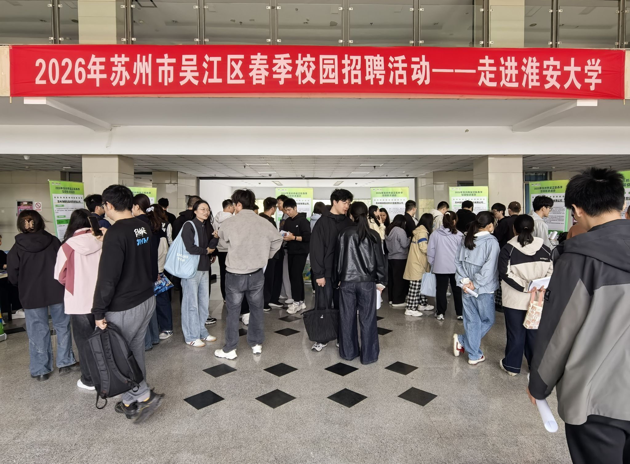 4月11日上午,淮安大学2026年苏州市吴江区企业春季专场招聘会在枚乘路校区逸夫楼二楼举行。校党委副书记秦家沛到现场调研指导工作。